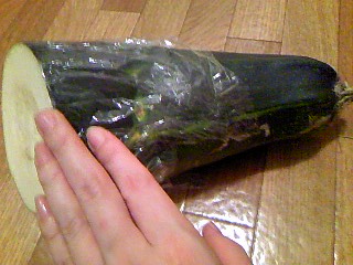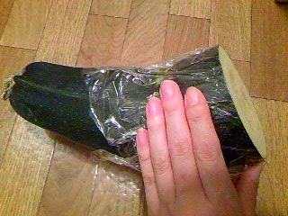 こんな大きなズッキーニってあるんですね。初めて見ました。いったい普通のズッキーニの何本分なんでしょう。なんだかドキドキしちゃいます。んもう、ほんとに大好きズッキーニ!